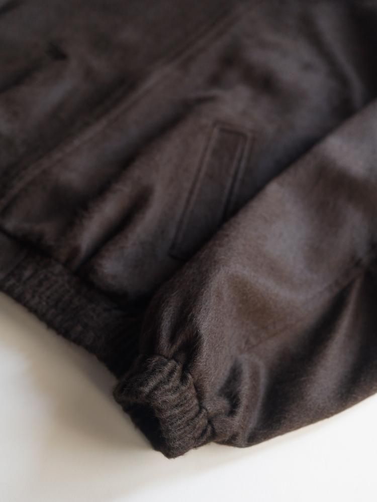 モンゴルの雄大な自然に育まれたベビーキャメルを100%使用し、丁寧に起毛加工を施したフランネル素材。柔らかくしっとりとした質感が魅力で、滑らかで繊細な毛並みが、高級感あふれる上質な仕上がりを実現。オーバーサイズフィットのジップブルゾン。