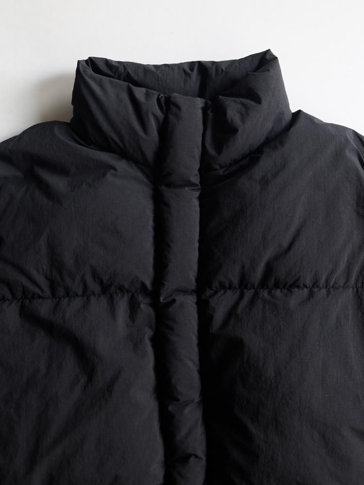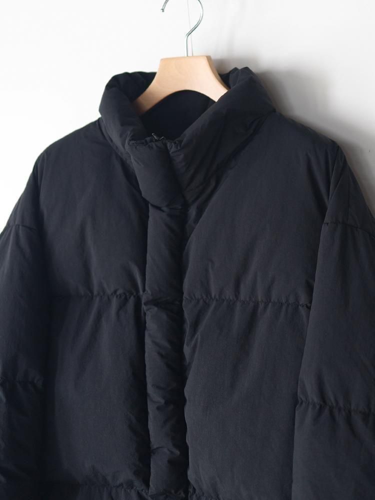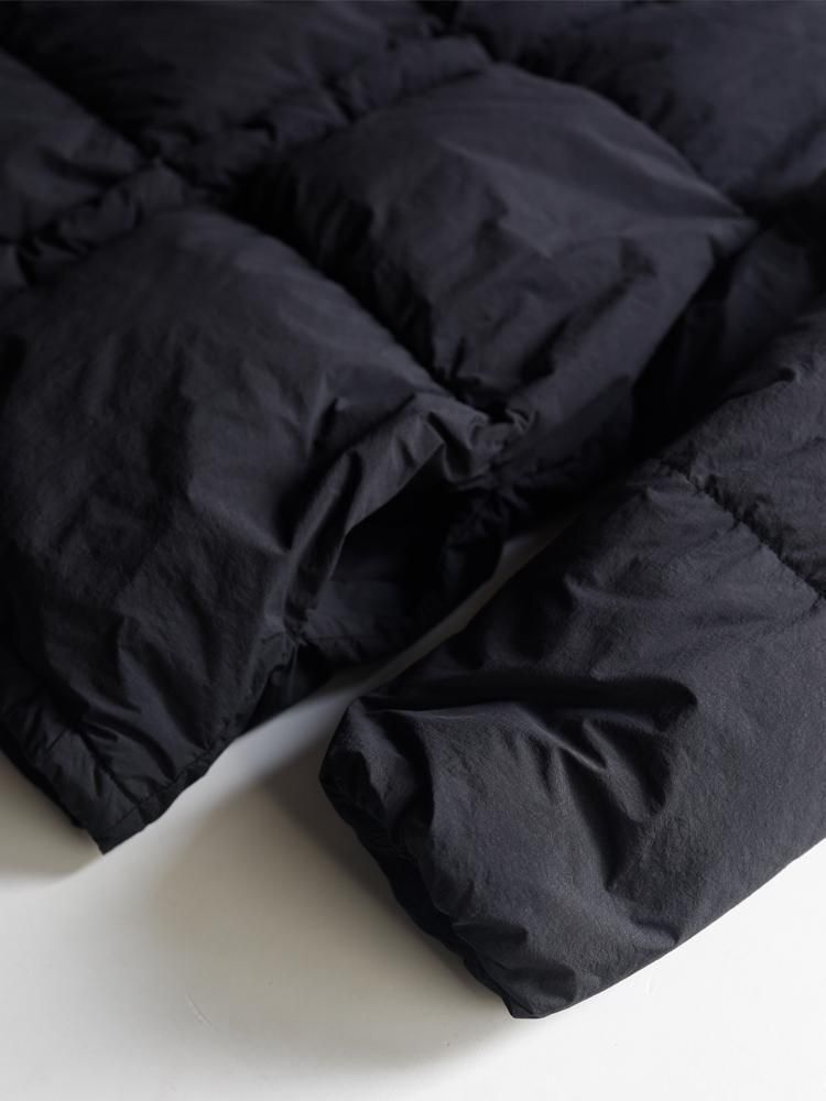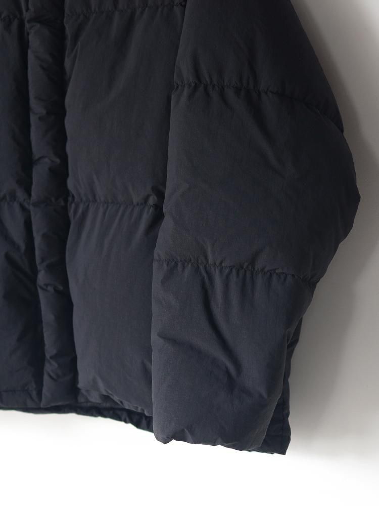 高密度に製織して表面を微起毛させた無染色のナイロンを使用したダウンジャケット。縫製後に染色を施すことで独特な色ムラや縮みによるパッカリングとアタリ、ドライな質感でペーパーライクなハリ感も特徴。大胆に3分割したダウンルームに良質な羽毛を贅沢に詰め込んだボリュームのあるシルエットが主張する一着。ポケットに裾ドローコードを隠したミニマルなディティールも魅力です。