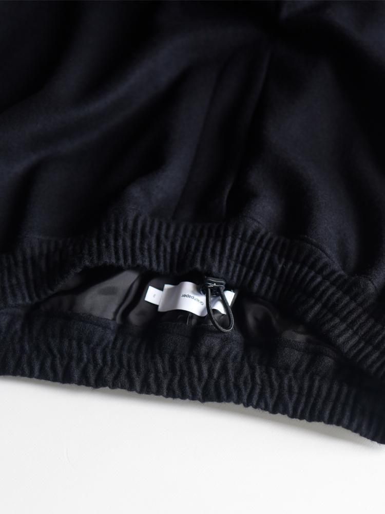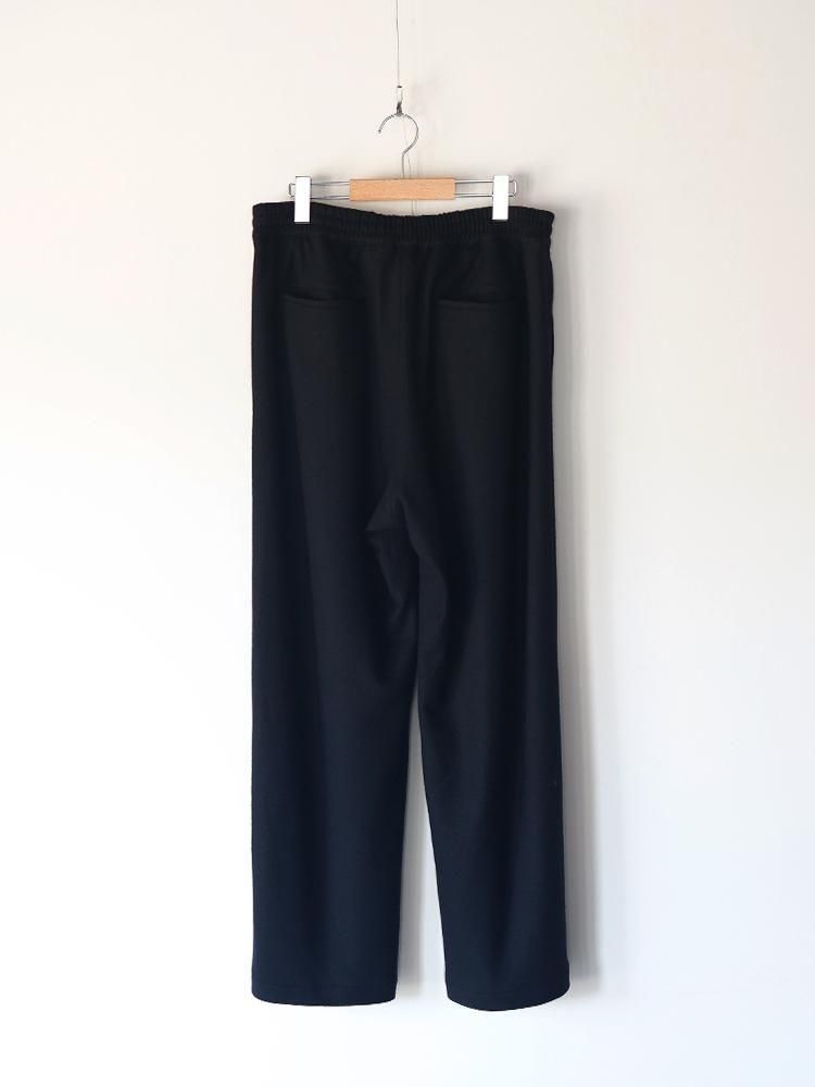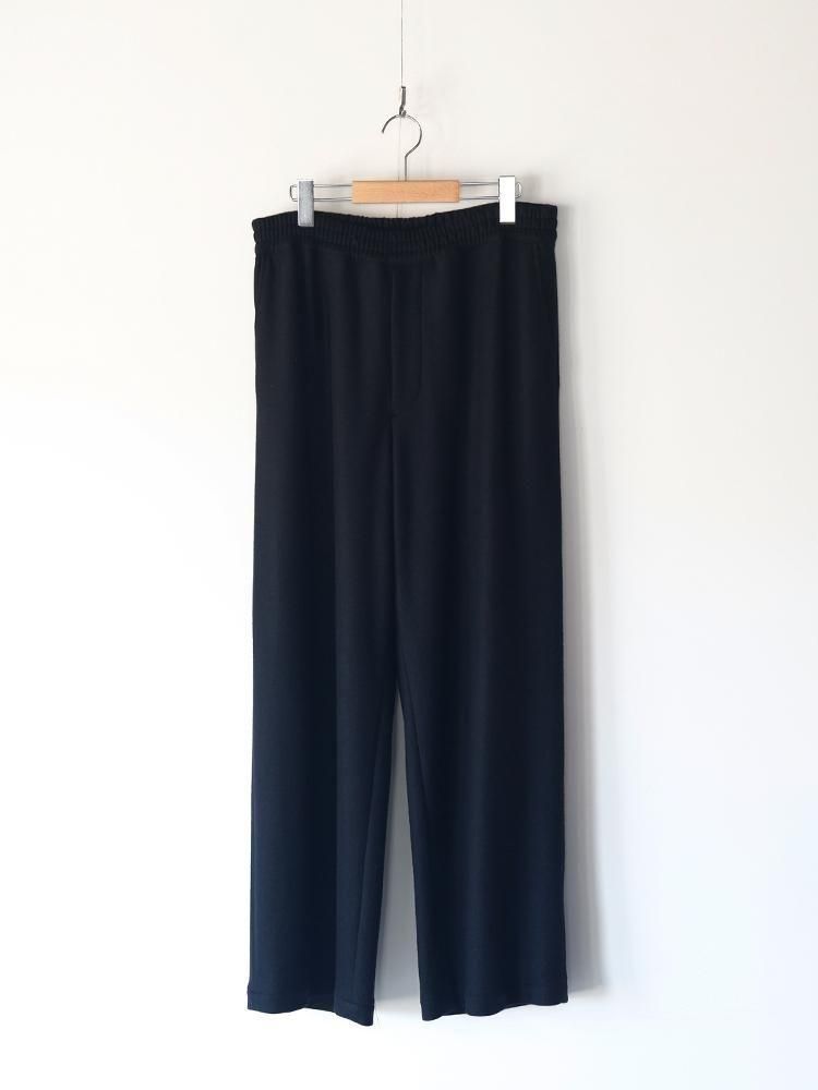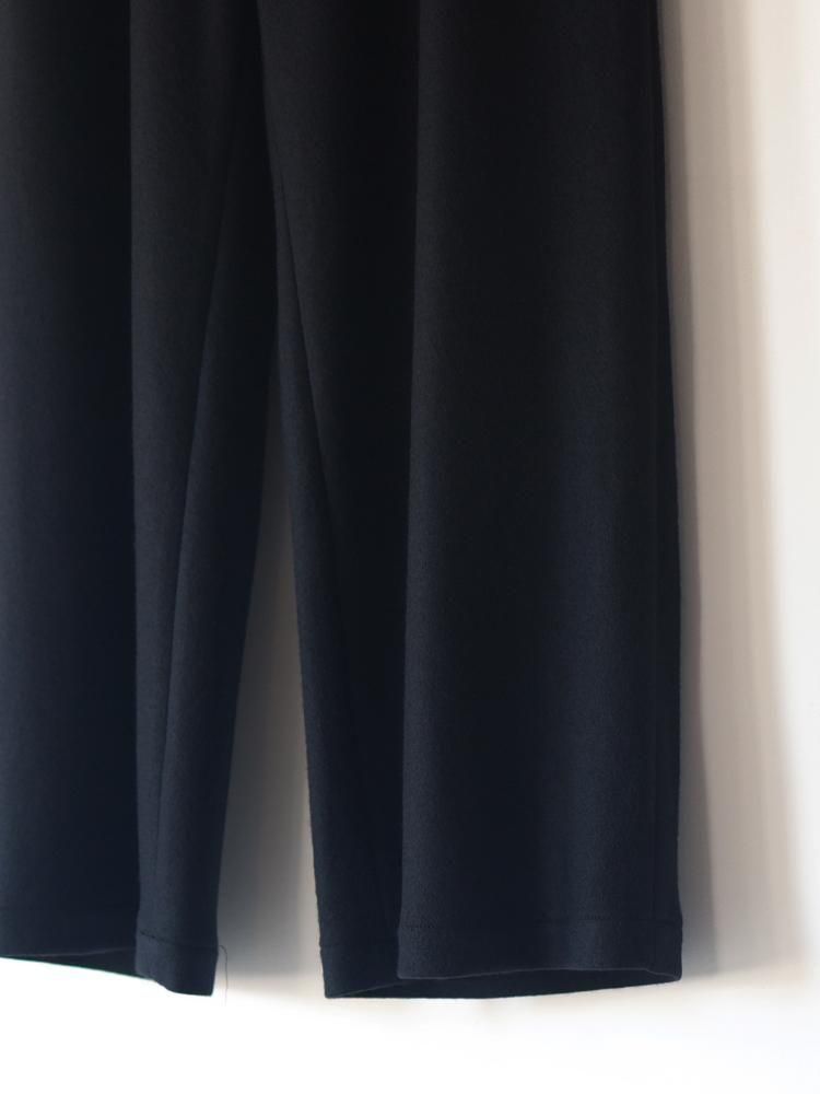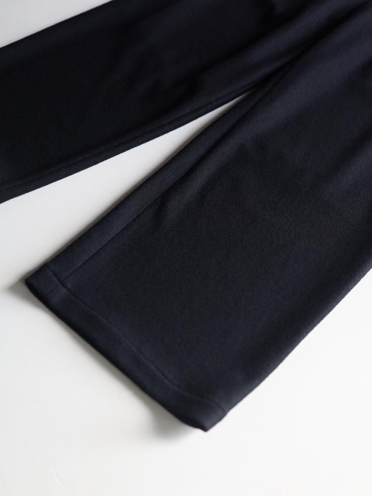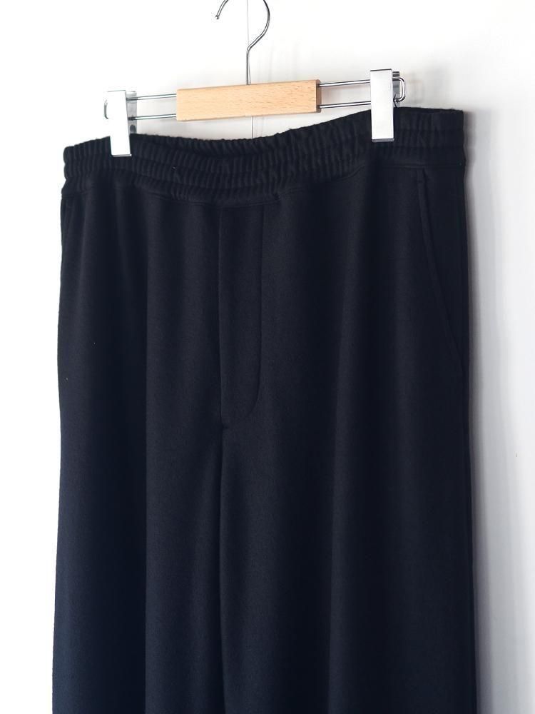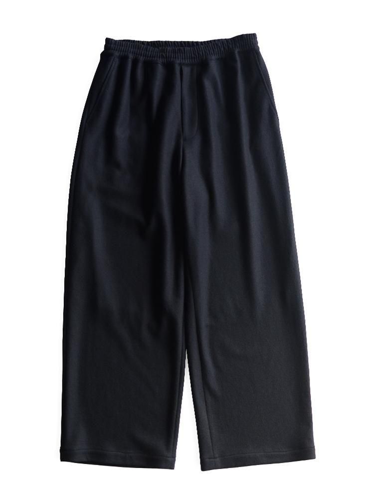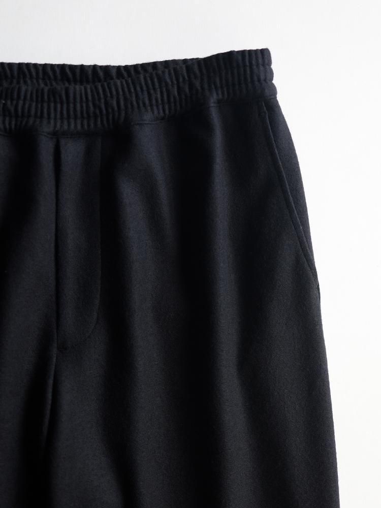 上質なウールスムースを高圧でミルド加工し、フランネルのような表情に仕上げたイージーパンツ。圧縮による適度なハリと柔らかさを備え、スケールオフ加工でハンドウォッシャブルも可能。上品な光沢としなやかなドレープが魅力。ゆったりとしたシルエットと快適な穿き心地で、日常から上質を感じられる一本に。